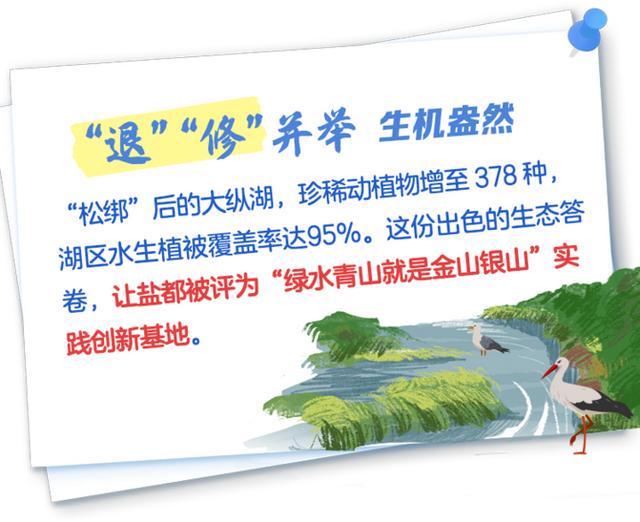 大纵湖的蜕变,为蟒蛇河注入了源头活水,而盐都的绿色征程并未止步。2016年开始,盐都着力打造融合健身绿道、水上观光、红色教育、文化体验于一体的蟒蛇河水上生态廊道,构建“游览线路+服务驿站+核心景点+乡村田园”立体体系,让河畔美景四季常新。今年,蟒蛇河成为盐城市首个省级美丽河湖。盐都也先后荣获国家生态文明建设示范区、“中国天然氧吧”称号,生态优势正加速转化为发展优势。