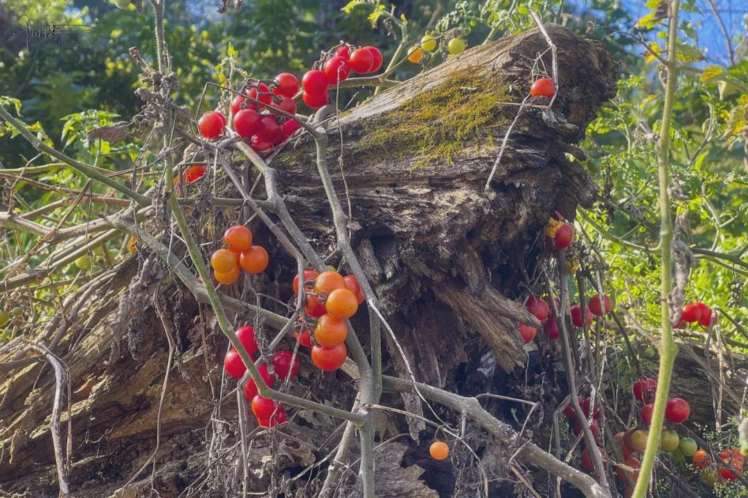 四顾无人,掏出相机上上下下、左左右右、前前后后各照了一遍,然后嘛……嘿嘿,悄悄摘了一颗,先仔细观察,再轻捏几下,闻闻味道,确定有股子淡淡的蕃茄味后,才小心翼翼地剥皮,尝之!!别看它们个头小,其实已经有点“老”了,里面的果肉和水分虽然依旧充足,口感已经带着几分软糯,蕃茄籽更是已经略微发黑发硬。